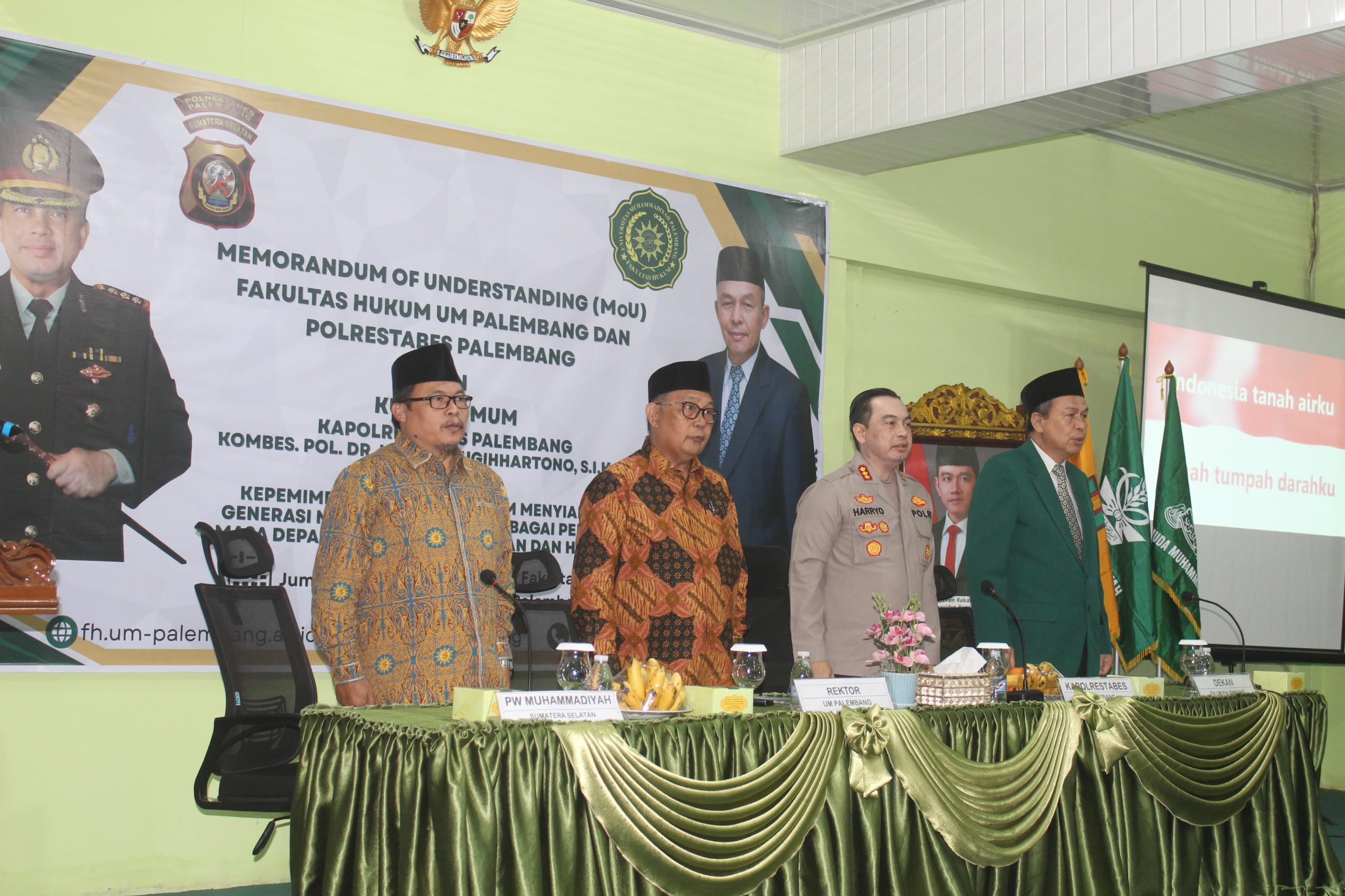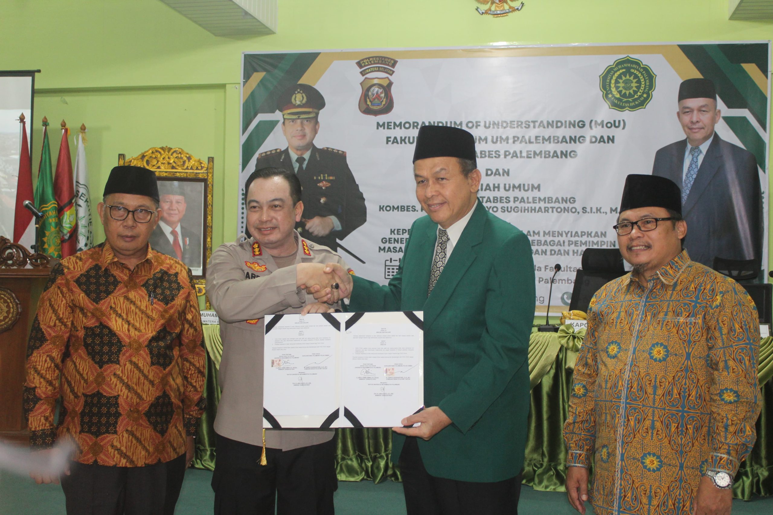 Penandatanganan MoU tersebut ditandatangani oleh Rektor Universitas Muhammadiyah Palembang Prof. Dr. Abid Djazuli, S.E., M.M., dan Kapolrestabes Palembang Kombes.Pol Dr. Harryo Sugihhartono, S.I.K., M.H., kemudian dilanjutkan penandatanganan Memorandum of Agreement (MoA) bersama Dekan Fakultas Hukum Universitas Muhammadiyah Palembang Abdul Hamid Usman, S.H., M.Hum.