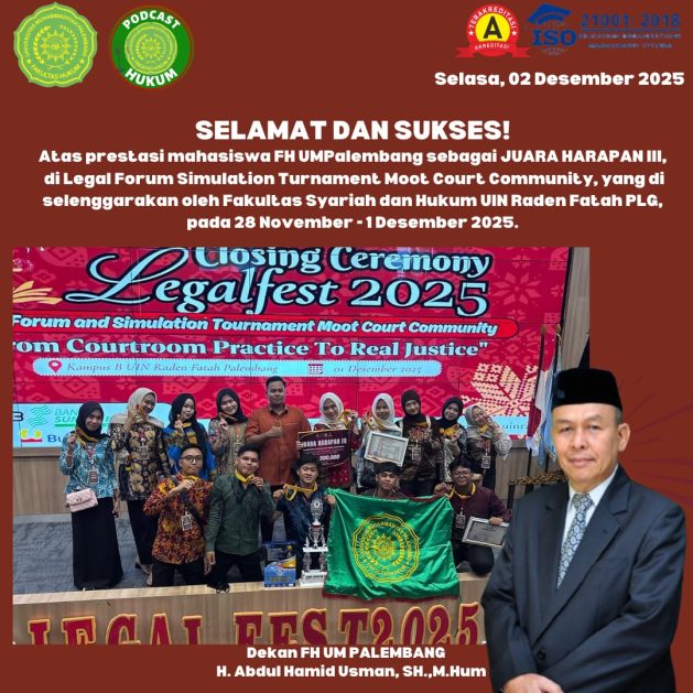 Himpunan mahasasiswa MoutCourt Competition (MCC) Fakultas Hukum Universitas Muhamamdiyah Palembang raih juara III di legal forum sumilation turnament moot court community yang diselenggarakan oleh Fakultas Syariah dan Hukum UIN Raden Fatah Palembang pada 28 November sampai dengan 1 Desember 2025.
